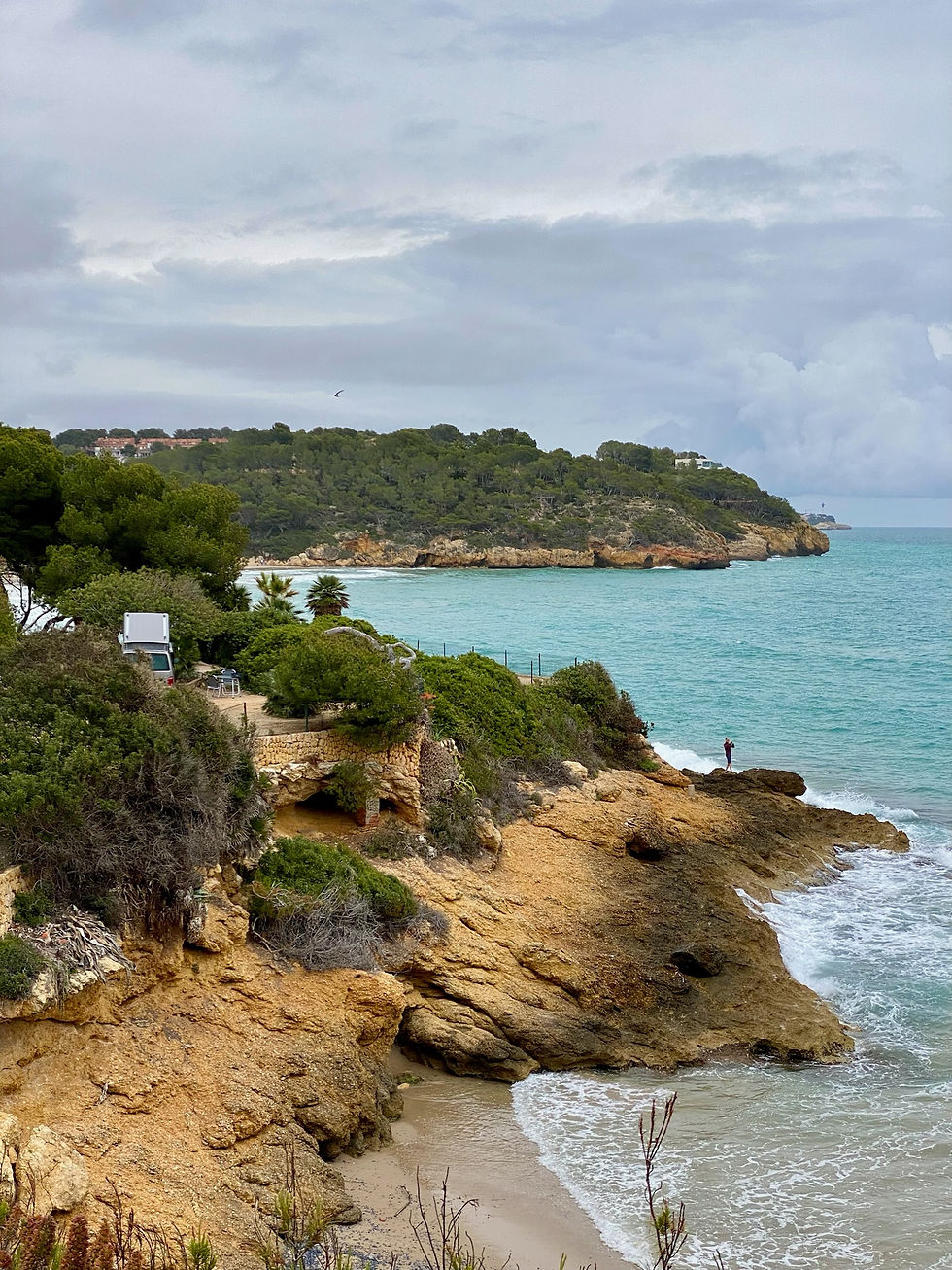 Après 300 km on arrive à la Mora, un peu avant Tarragone, au camping Torre de la Mora. L’accueil est très sympa et on se fait accompagner par un monsieur sur sa petite voiture électrique qui nous donne une magnifique place en dehors du « parking des campings cars »… juste au dessus de la mer et entre un petit bosquet d’arbres et des pins tortueux.