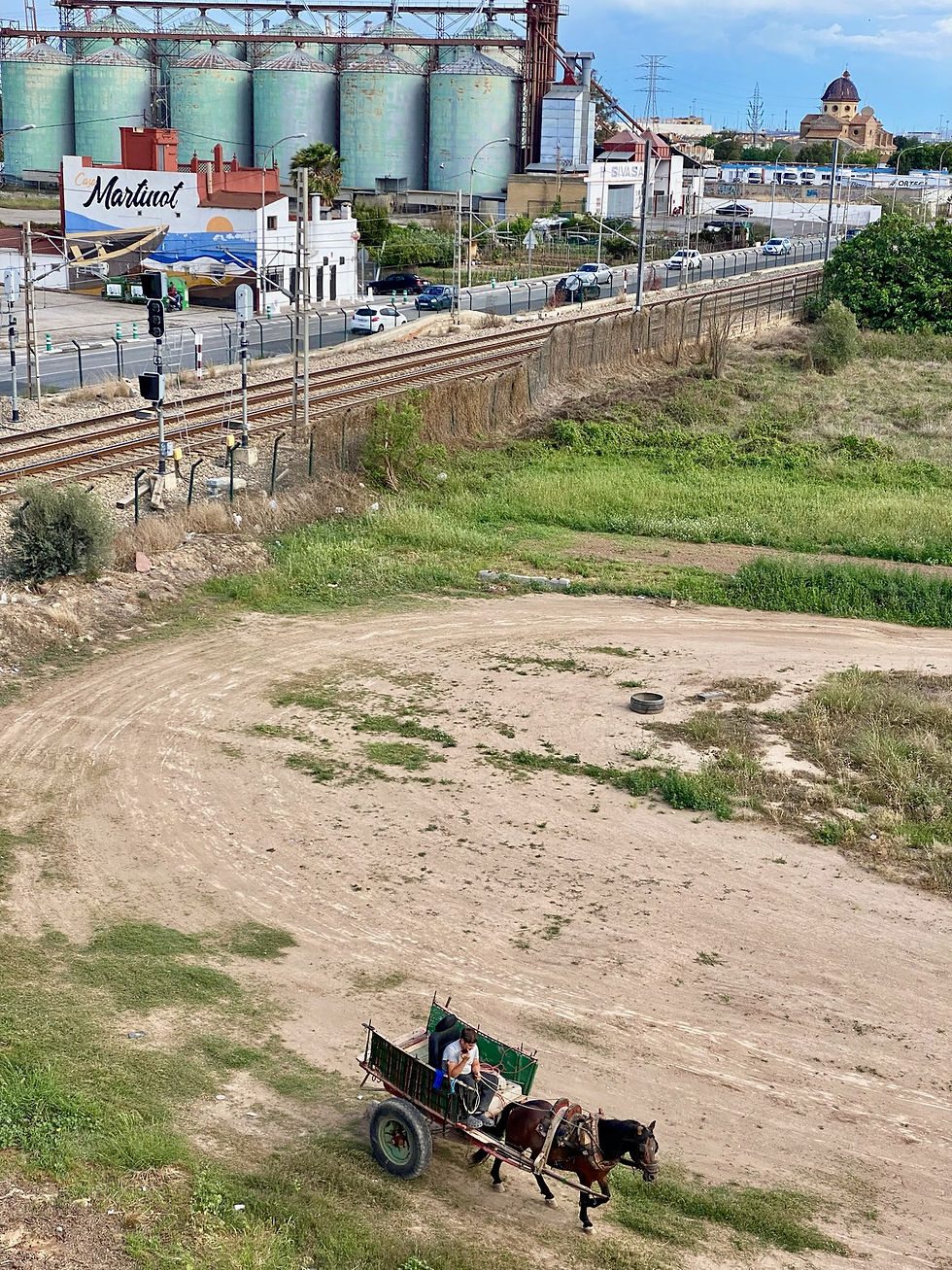 On emprunte la piste cyclable qui longe la mer puis le port de Valence avant d’arriver en pleine ville où se côtoient des zones ultra modernes et d’autres à l’abandon… on aperçoit un homme qui fait tourner son cheval attelé à un chariot dans un terrain vague et qui tourne en rond… on se demande quelle peut bien en être la raison! Est-ce qu’il s’entraîne pour tirer des calèches pour les touristes?
