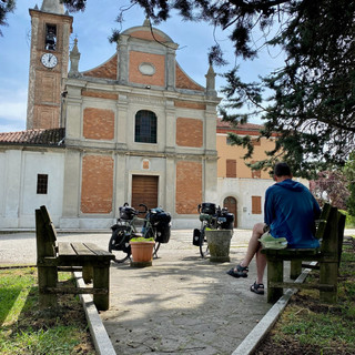 On emprunte de jolies petites routes serpentant dans la campagne et changeant de cap assez souvent, vent de face, de dos, latéral...on fait un peu la girouette. Ceci jusqu'à Fidenza où c'est l'heure d'un bon espresso puis on a droit aux routes principales plutôt fréquentées , et je vous explique, les italiens en général ont le sang chaud! Et plutôt que de ralentir pour croiser, ils forcent le passage et nous pousseraient dans le talus éventuellement pour ne pas perdre une minute! Bref, ce n'est pas de tout repos...